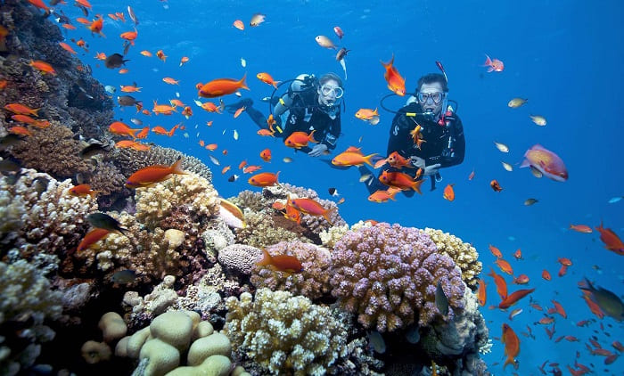 Explore the vibrant aquarium of rich coral reefs.